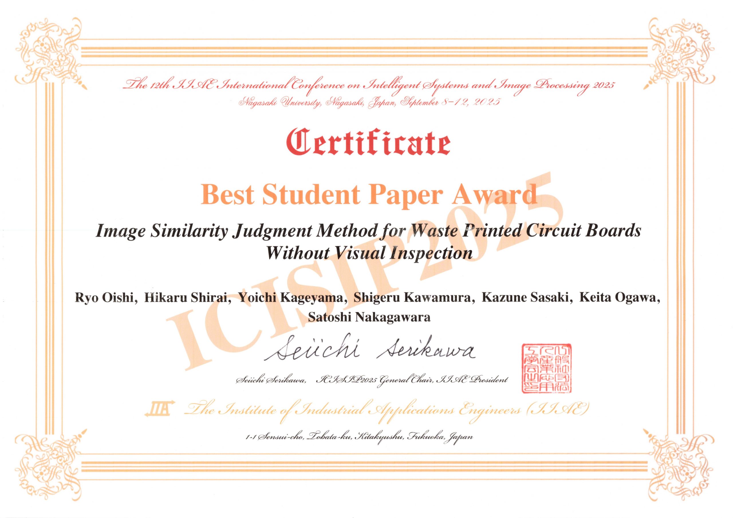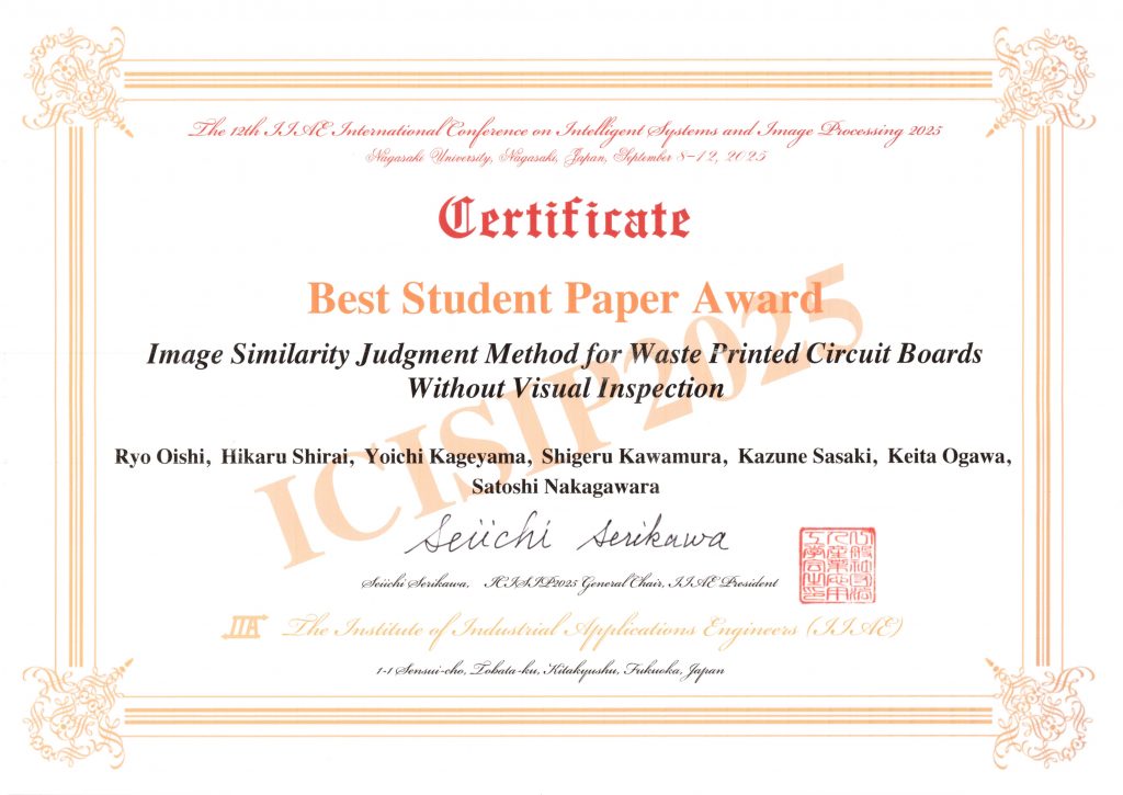 ・Ryo Oishi, Hikaru Shirai, Yoichi Kageyama, Shigeru Kawamura, Kazune Sasaki, Keita Ogawa, Satoshi Nakagawara : Image Similarity Judgment Method for Waste Printed Circuit Boards Without Visual Inspection, The 12th IIAE International Conference on Intelligent Systems and Image Processing 2025 (ICISIP2025), G5-4