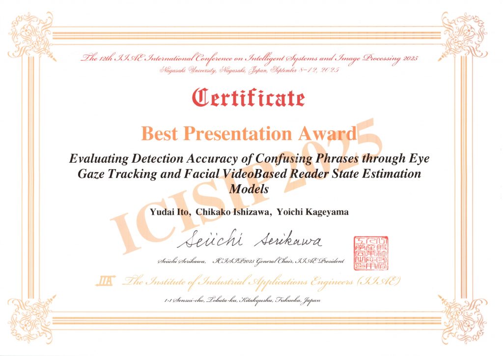 ・Yudai Ito, Chikako Ishizawa, Yoichi Kageyama : Evaluating Detection Accuracy of Confusing Phrases through Eye Gaze Tracking and Facial Video-Based Reader State Estimation Models, The 12th IIAE International Conference on Intelligent Systems and Image Processing 2025 (ICISIP2025), G5-3
