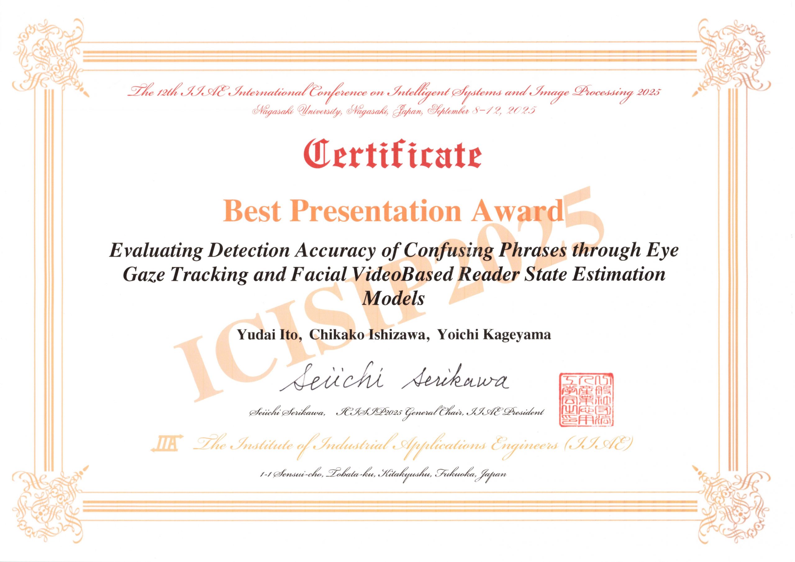 ICISIP2025において、伊藤悠大助教らがBest Presentation Awardを、大石稜さん(博士前期課程2年、景山・石沢研究室)がBest Student Paper Awardをそれぞれ受賞しました。