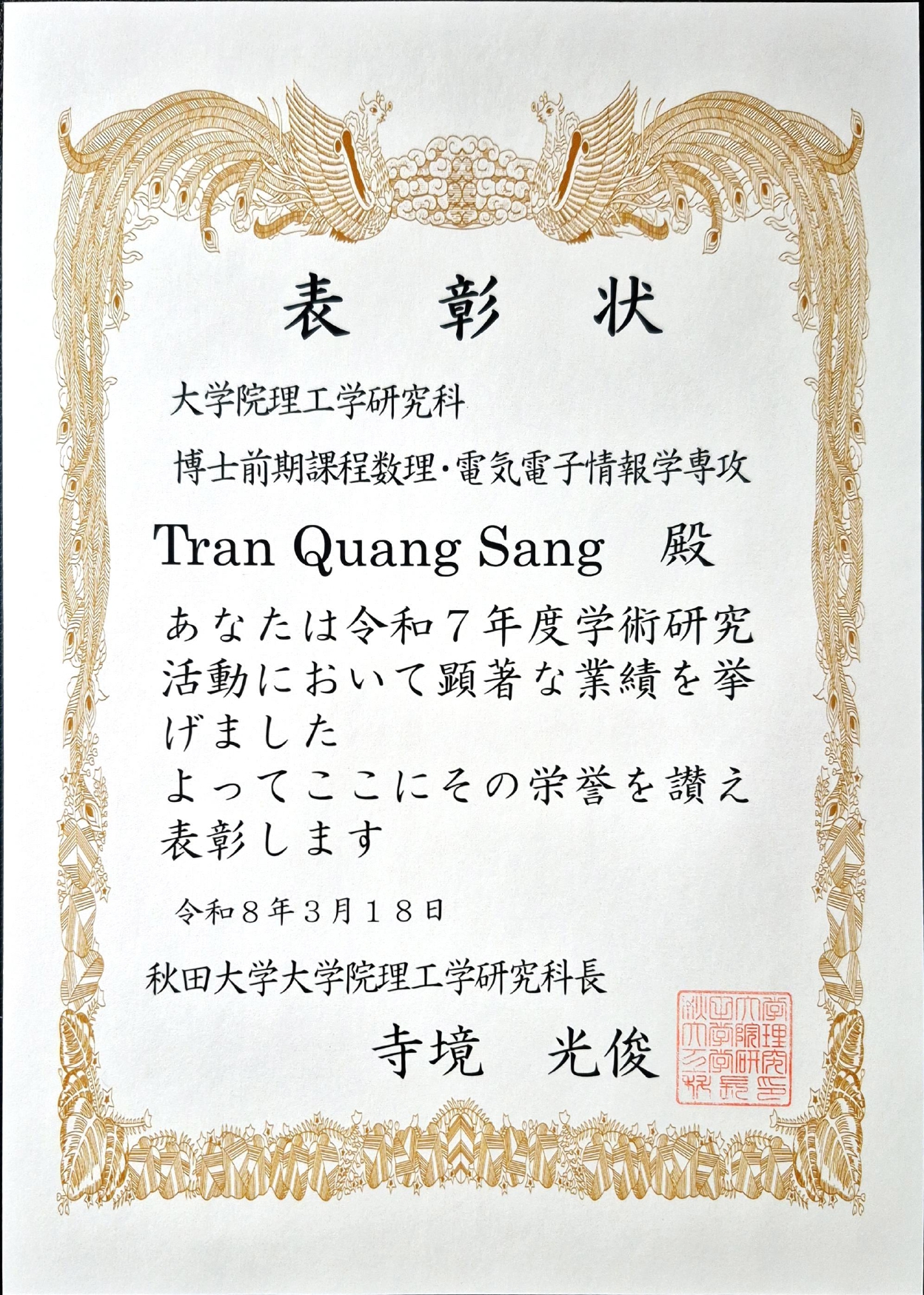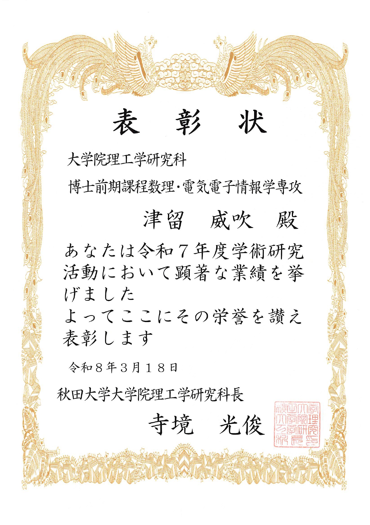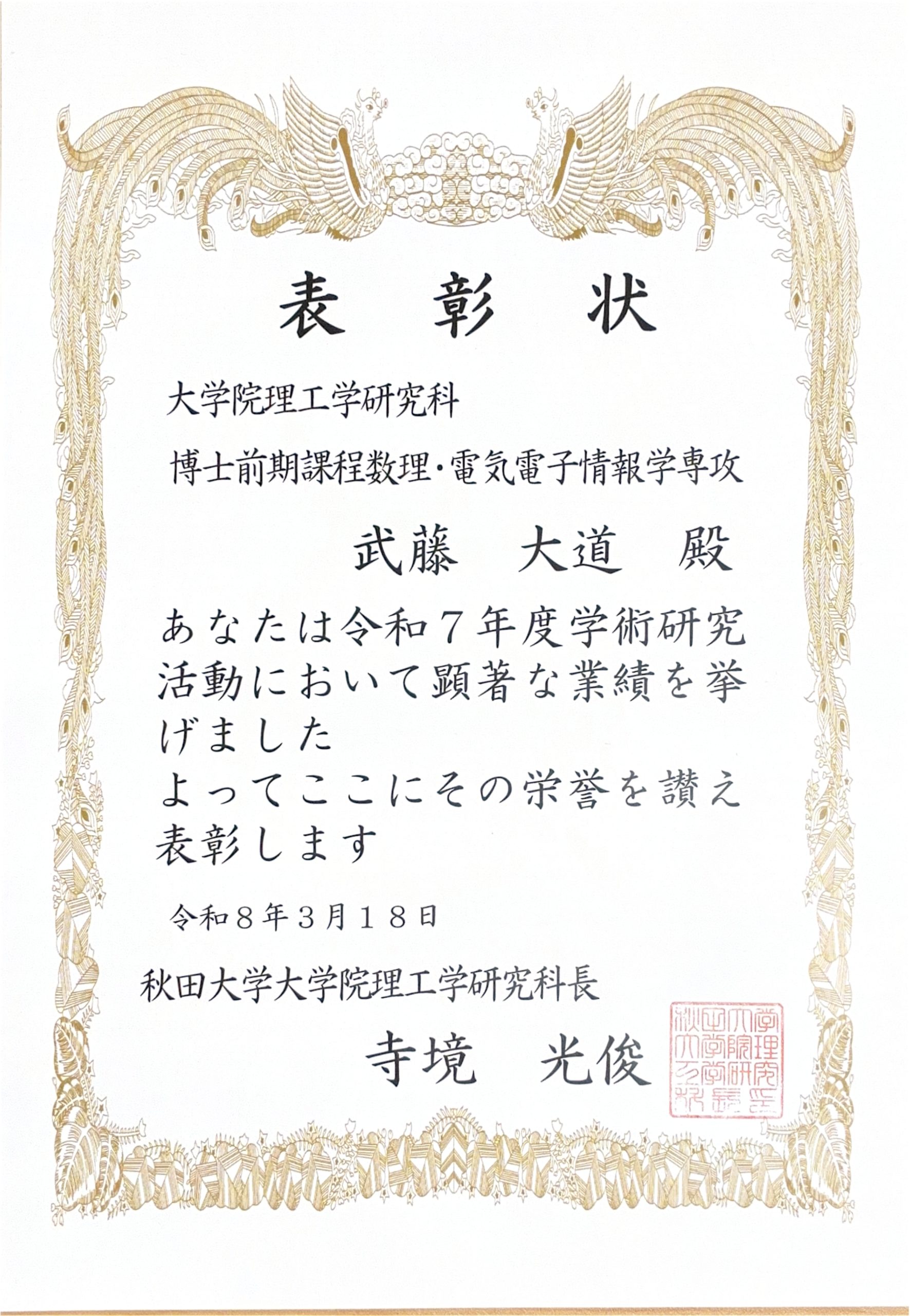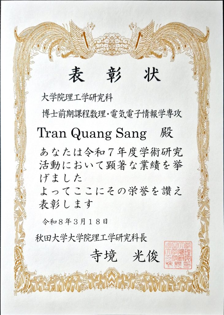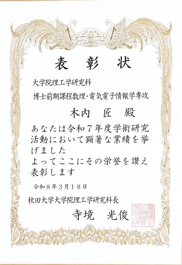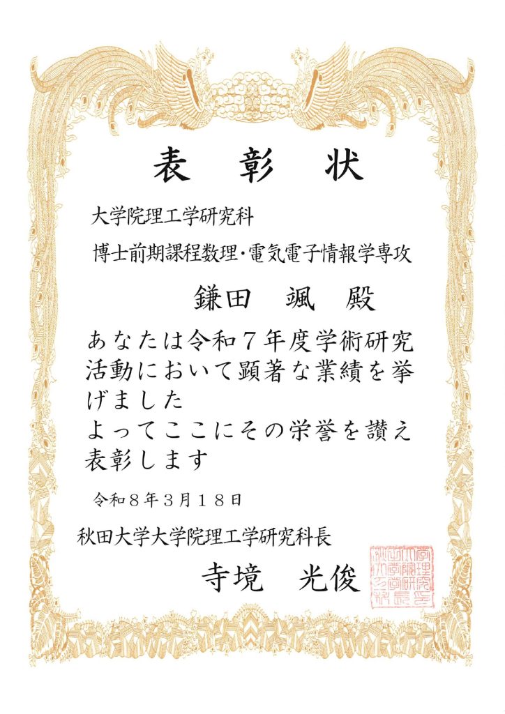 本コースの学生が理工学研究科長表彰を受けました。 2026年3月18日 令和7年度 理工学研究科長表彰 鎌田 颯(博士前期課程2年、景山・石沢研究室) 木内 匠(博士前期課程2年、水戸部・藤原研究室) 須藤 悠介(博士前期課程2年、景山・石沢研究室) 山下 茜音(博士前期課程2年、景山・石沢研究室) Tran Quang Sang(博士前期課程1年、有川研究室) 津留 威吹(博士前期課程1年、景山・石沢研究室) 武藤 大道(博士前期課程1年、水戸部・藤原研究室)