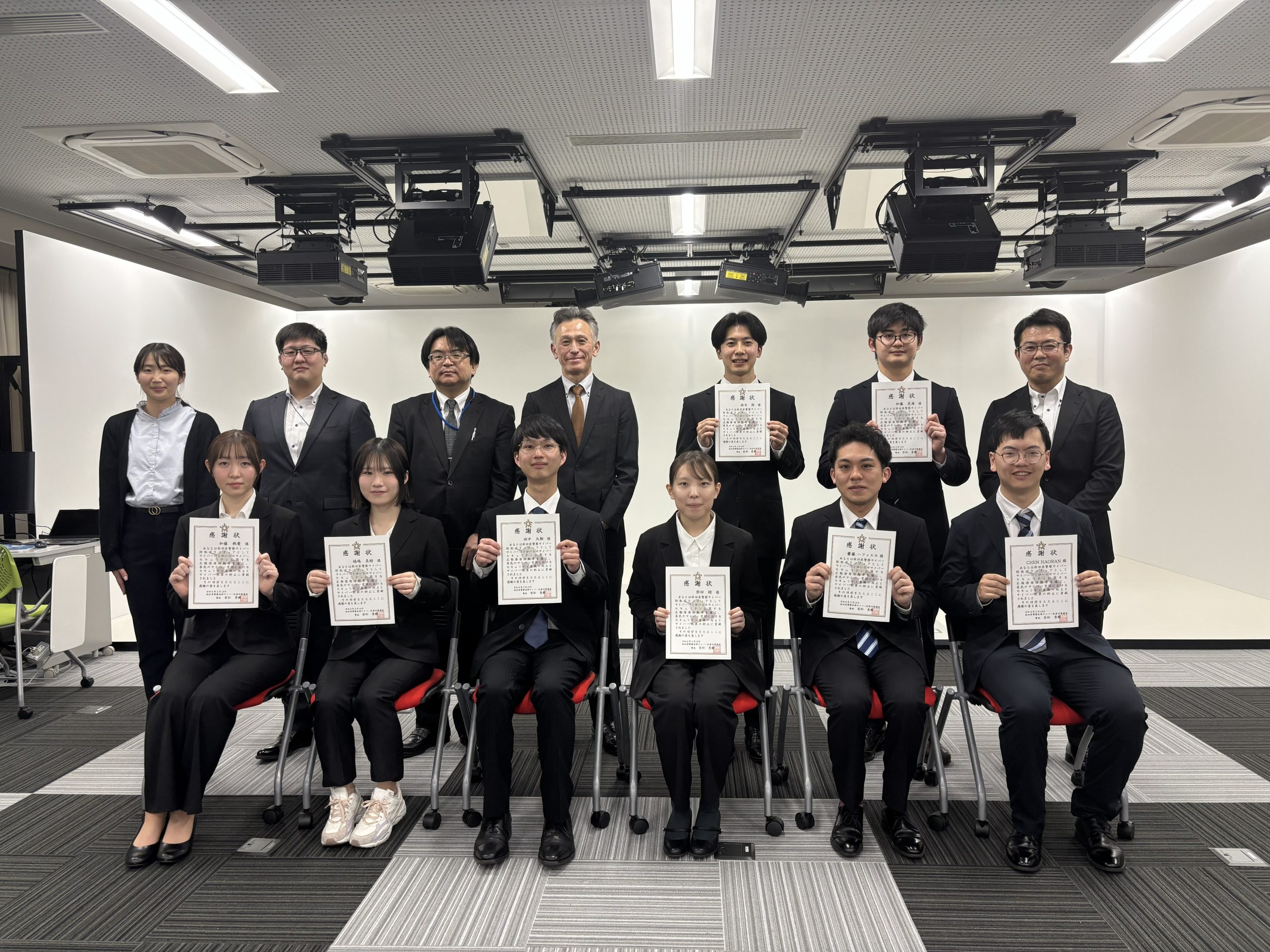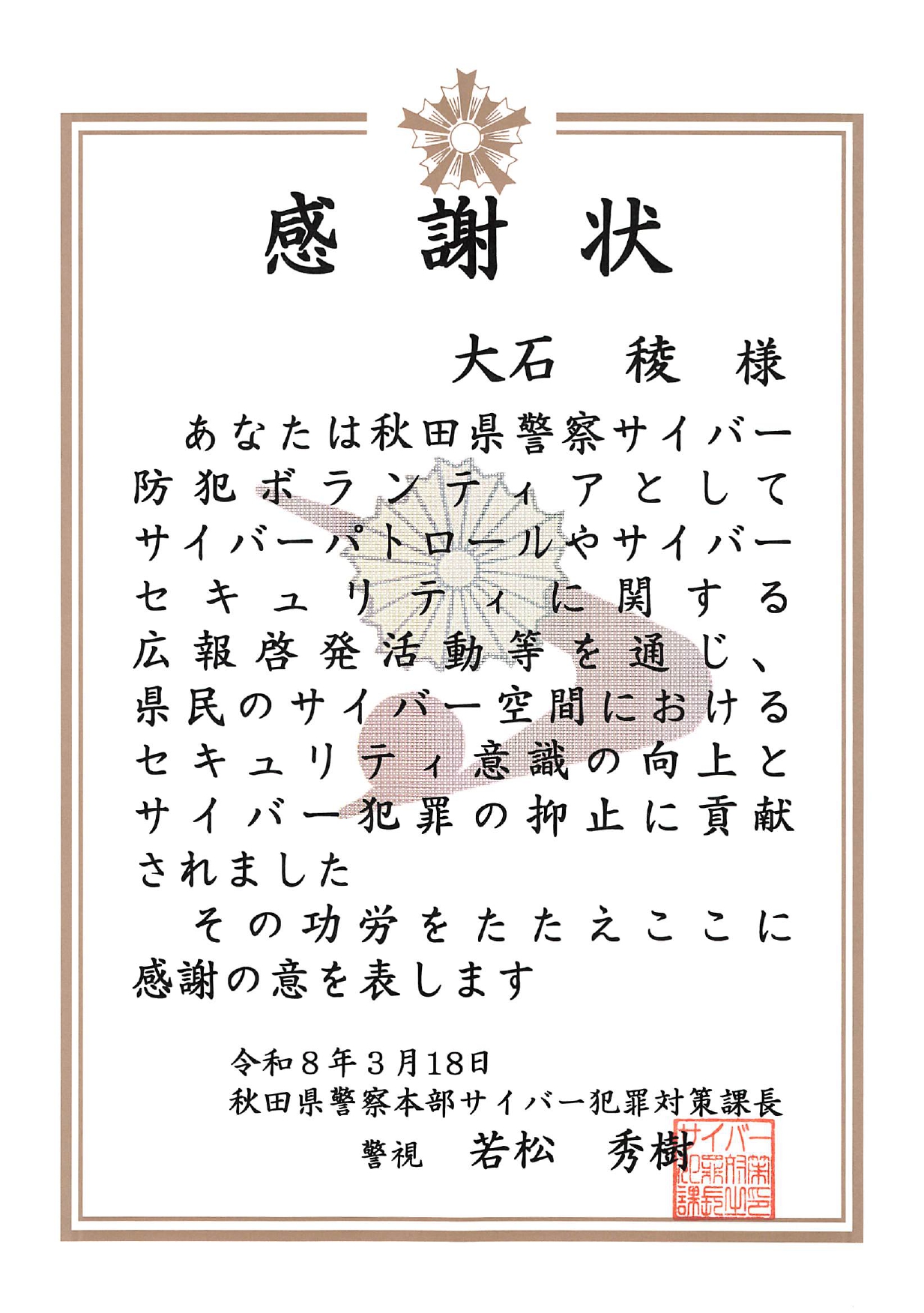 秋田県警察大学生サイバーボランティアとして、サイバーパトロールやサイバーセキュリティに関する広報啓発活動などを行い、サイバーセキュリティ意識の醸成に貢献したとして、以下の学生に秋田県警察から感謝状が授与されました。