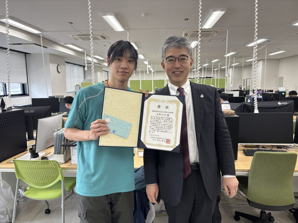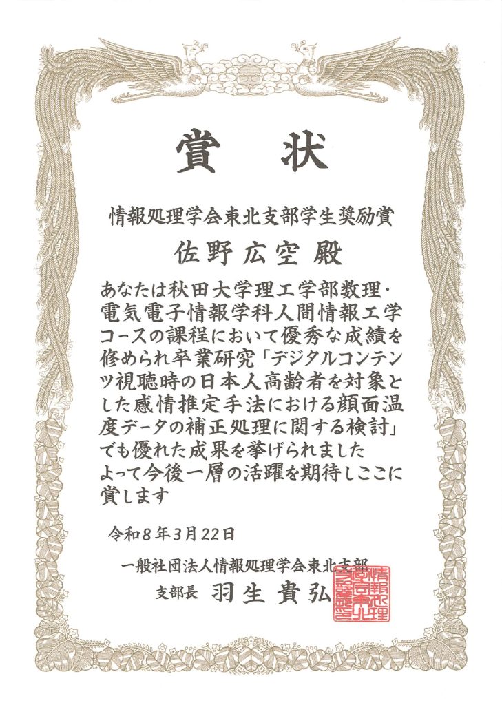 佐野広空さんが情報処理学会東北支部学生奨励賞を受賞しました。 佐野広空さん(学部4年、景山・石沢研究室)は、学部における学業や卒業課題研究の内容が評価され、令和7年度情報処理学会東北支部学生奨励賞を受賞しました。 2026年3月22日 令和7年度情報処理学会東北支部学生奨励賞佐野 広空(学部4年、景山・石沢研究室)